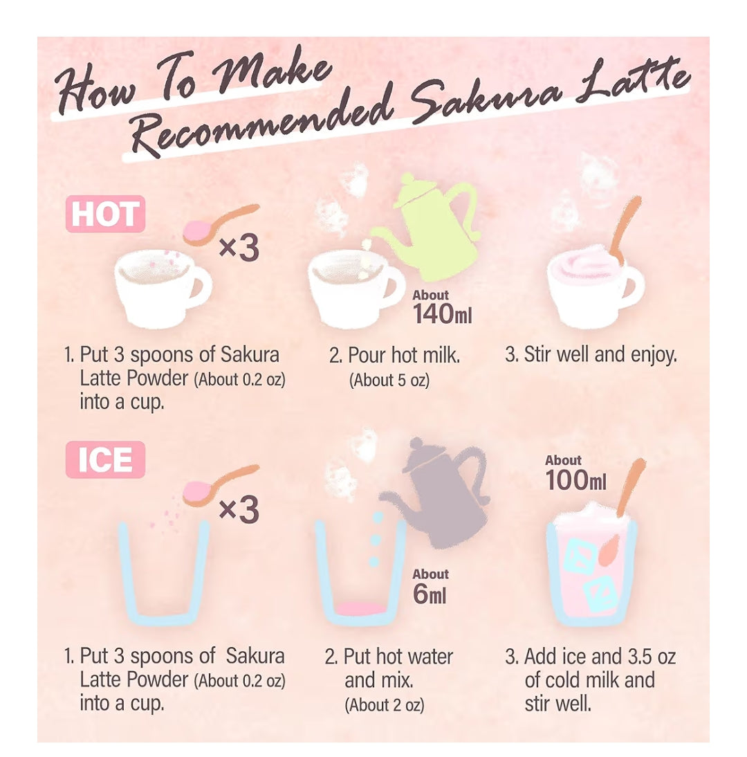 Cherry Blossom Latte Feel Spring Anyway to wyjątkowa japońska latte o smaku kwiatów wiśni, która pozwala cieszyć się wiosną przez cały rok. Delikatne, świeże japońskie kwiaty sakury zostały zmielone na aksamitny proszek, tworząc napój o subtelnym aromacie i pięknym, pastelowo-różowym kolorze.